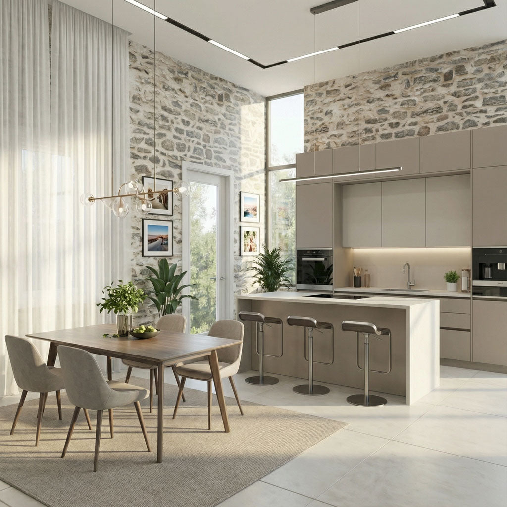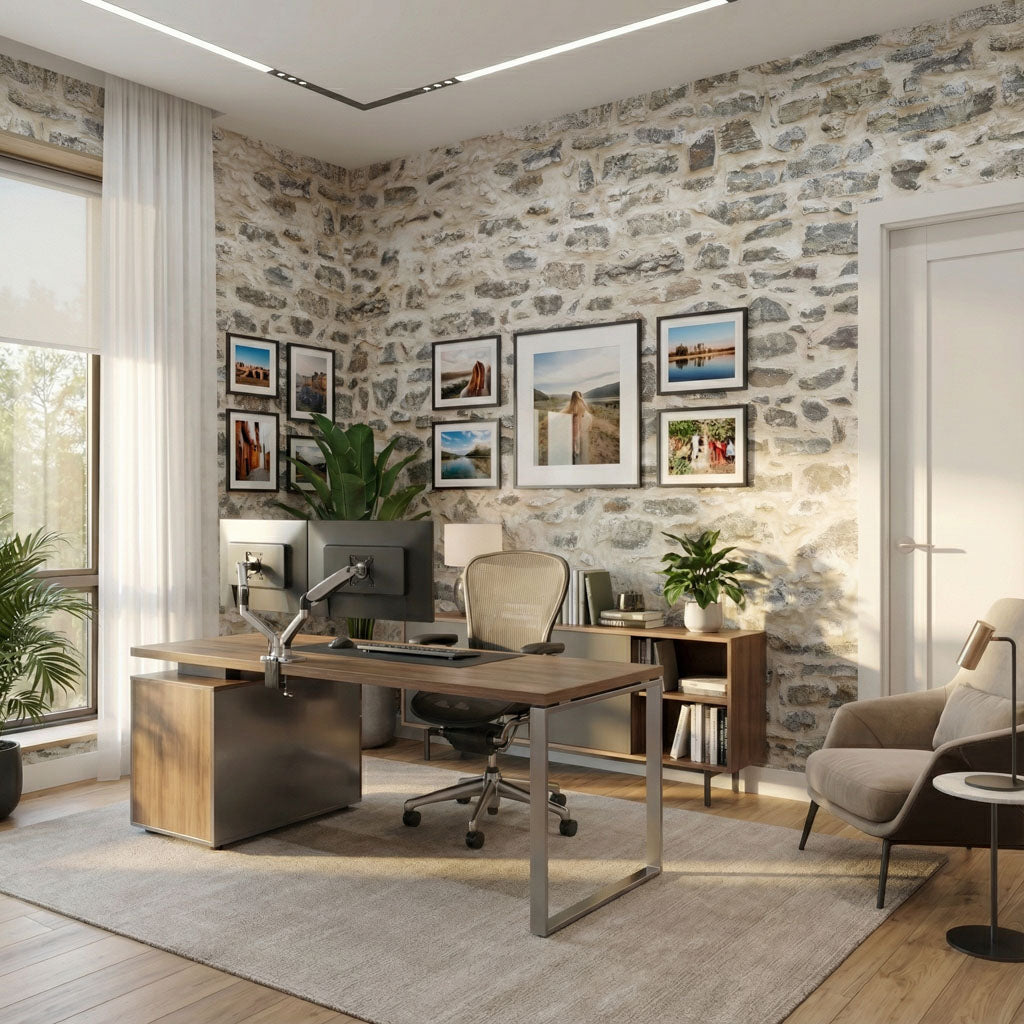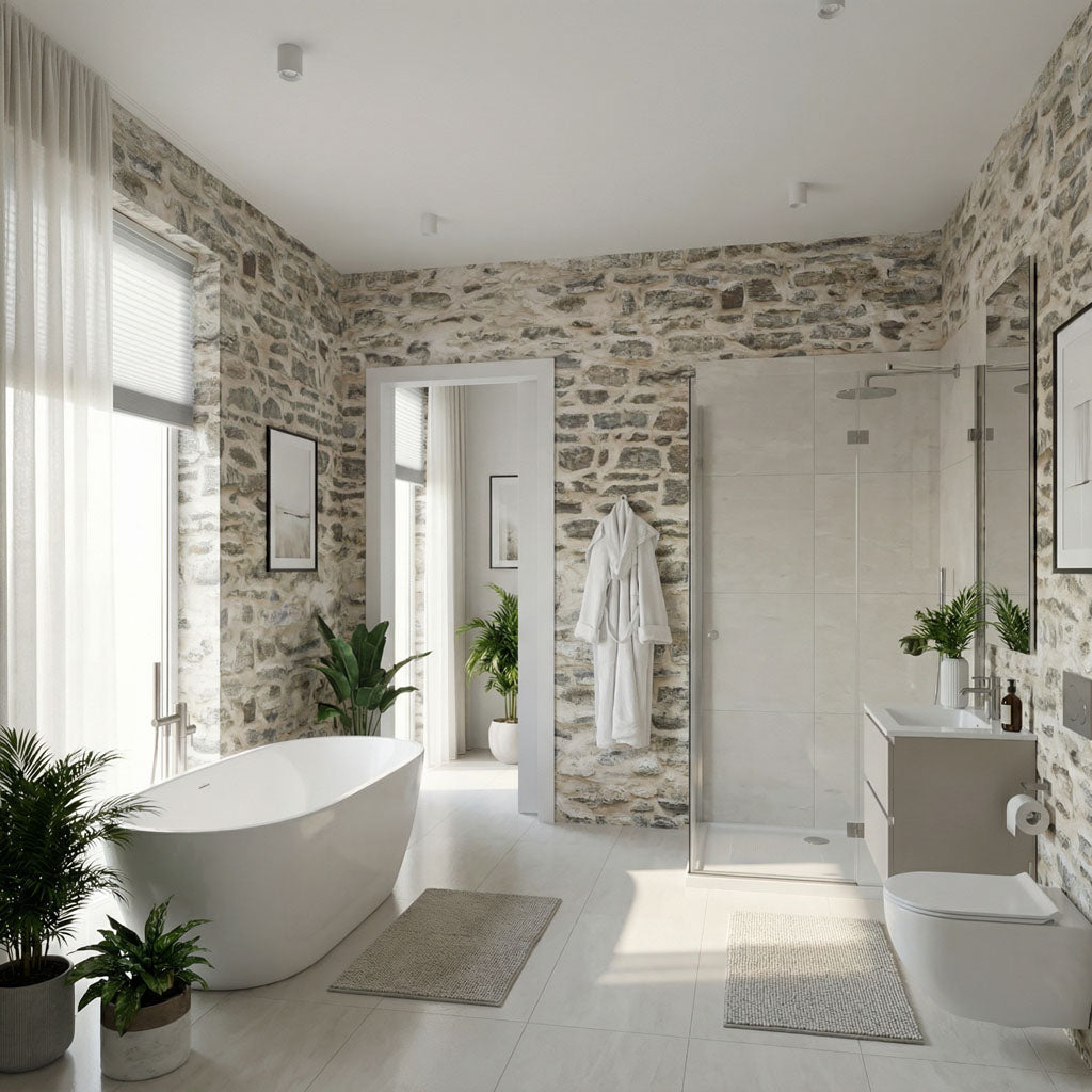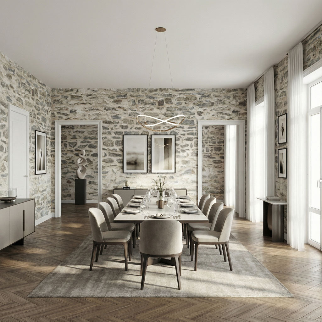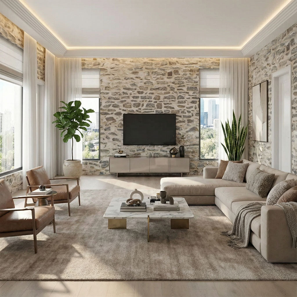 Drawing inspiration from the foundational buildings of 17th-century Quebec, this design features the distinct, horizontal layering of flat-faced limestone. The palette is a soothing blend of sun-washed beiges and soft greys, providing a structured yet calming backdrop for living rooms or home offices. The "Illusion" technology perfectly mimics the stacked precision of colonial masons, offering a clean, linear aesthetic that adds historical character to modern spaces.