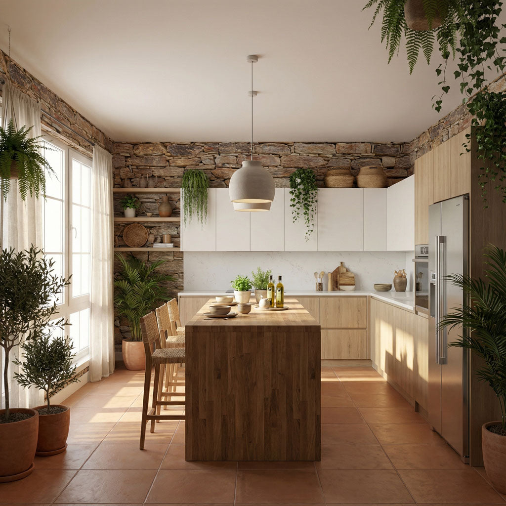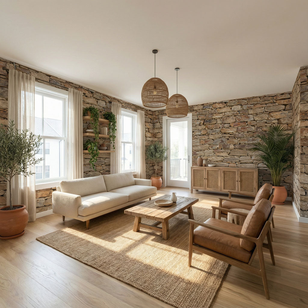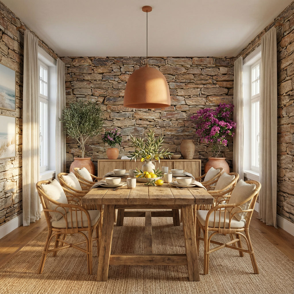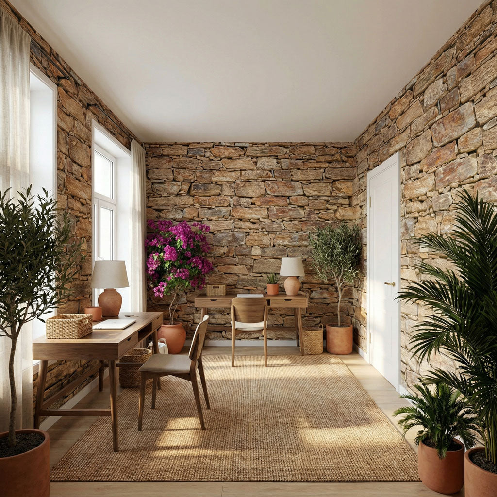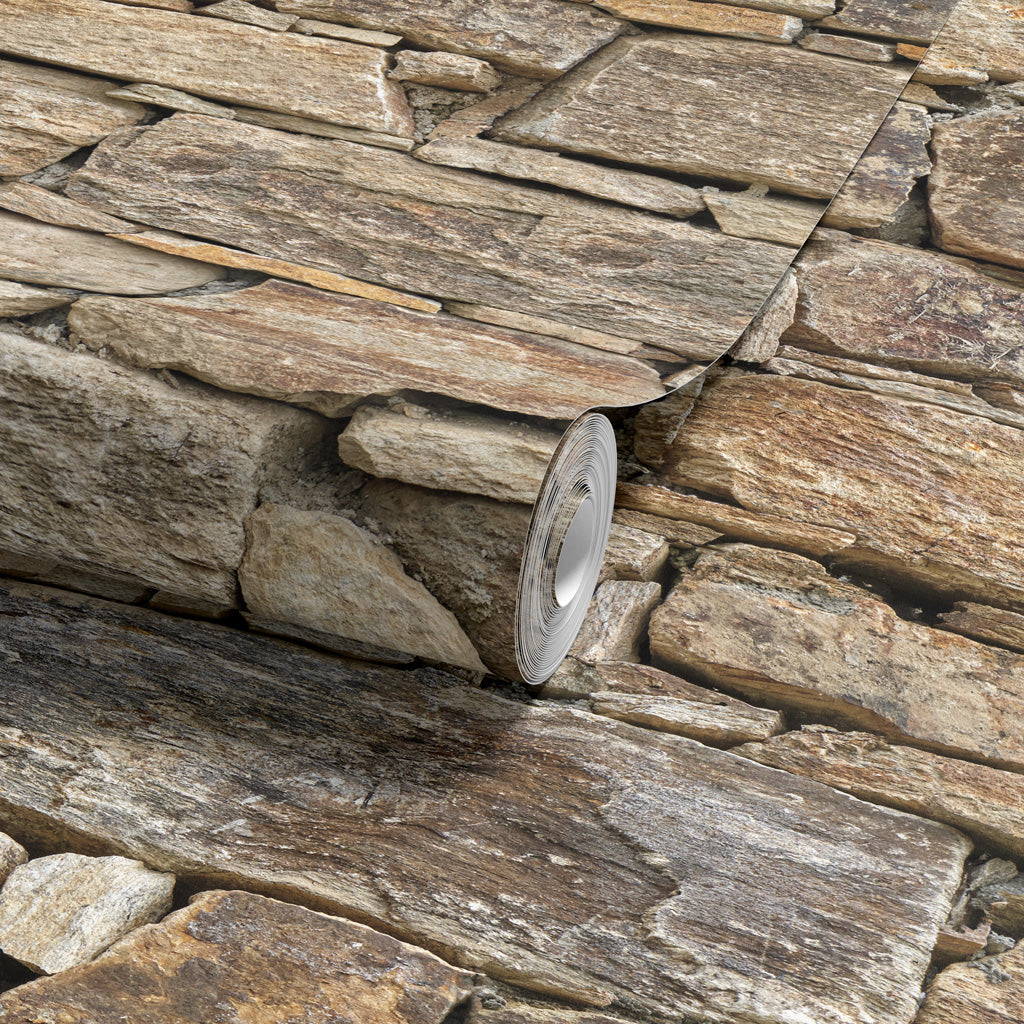 Inspired by the historic mountain villages of Andalusia's Sierra Nevada, this wallpaper captures the authentic charm of a dry-stone slate wall. The rich palette of rust, ochre, and golden brown reflects the ferruginous stone typical of this legendary region. With its robust horizontal layering and the striking 3D depth of "Illusion™" technology, it brings the earthy, grounded atmosphere of a Spanish cortijo into your home.