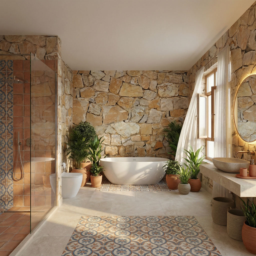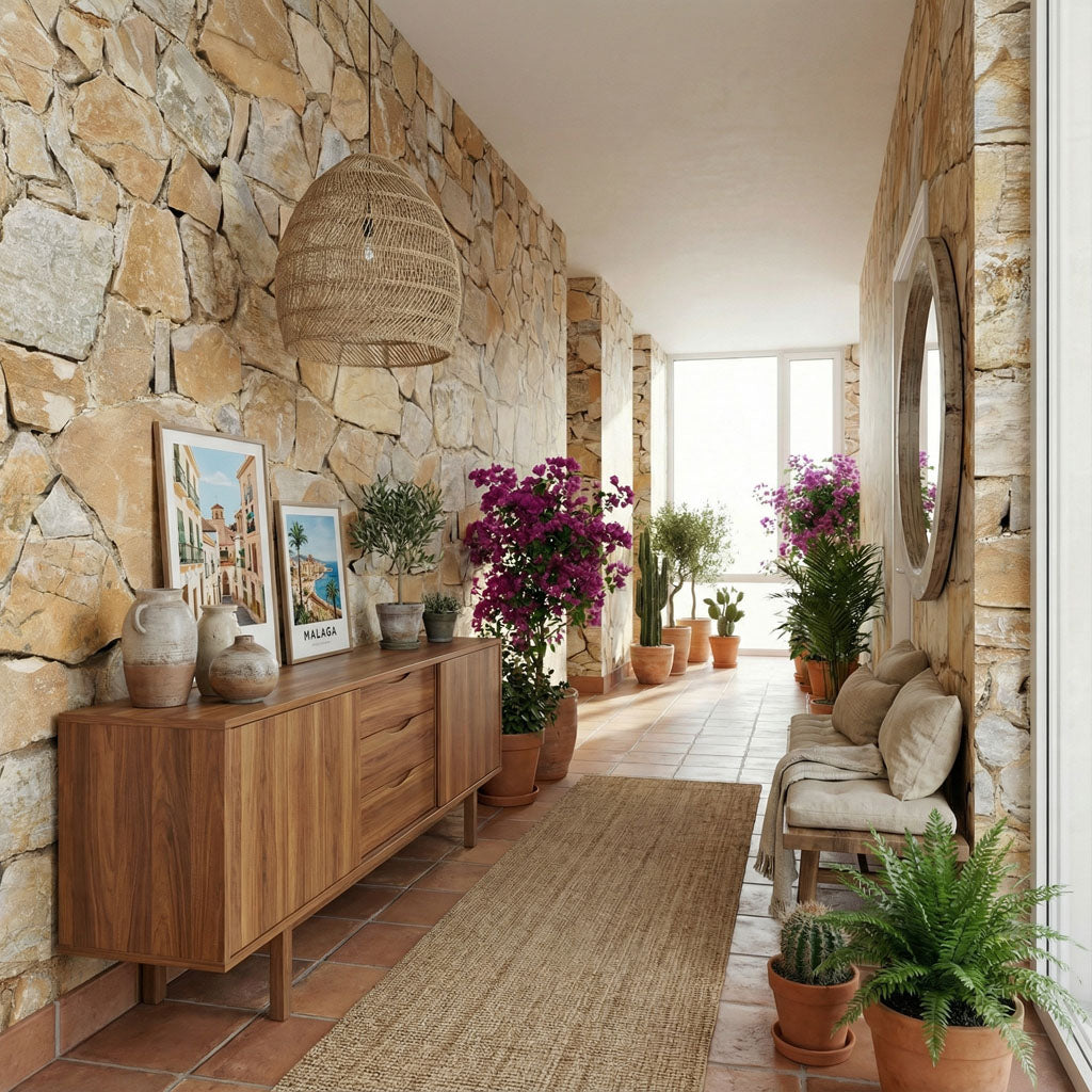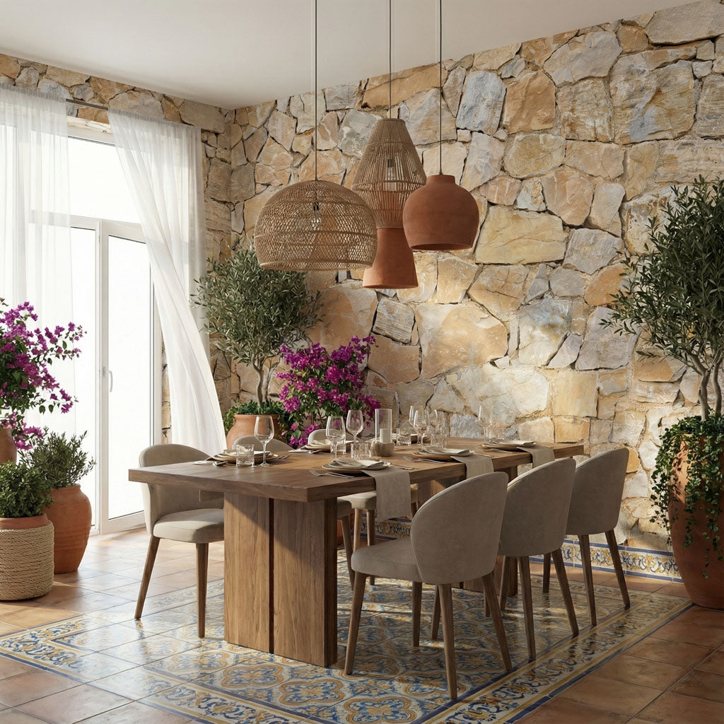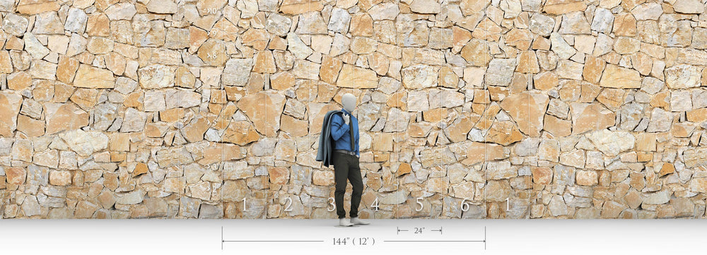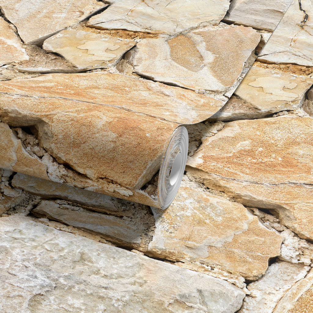 Inspired by the majestic hilltop city of Malaga, this wallpaper reproduces the warm, golden stonework of its historic bridges and fortifications. Irregular, sun-drenched limestone blocks are assembled in a traditional rustic pattern that evokes the warmth of southern Spain. Enhanced by "Illusion" technology, it brings the prestigious and authentic atmosphere of an Andalusian finca directly into your home.