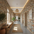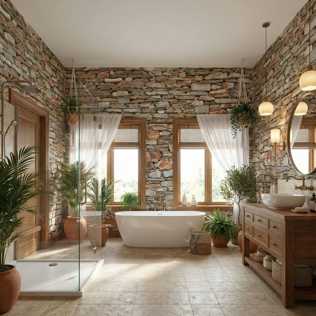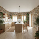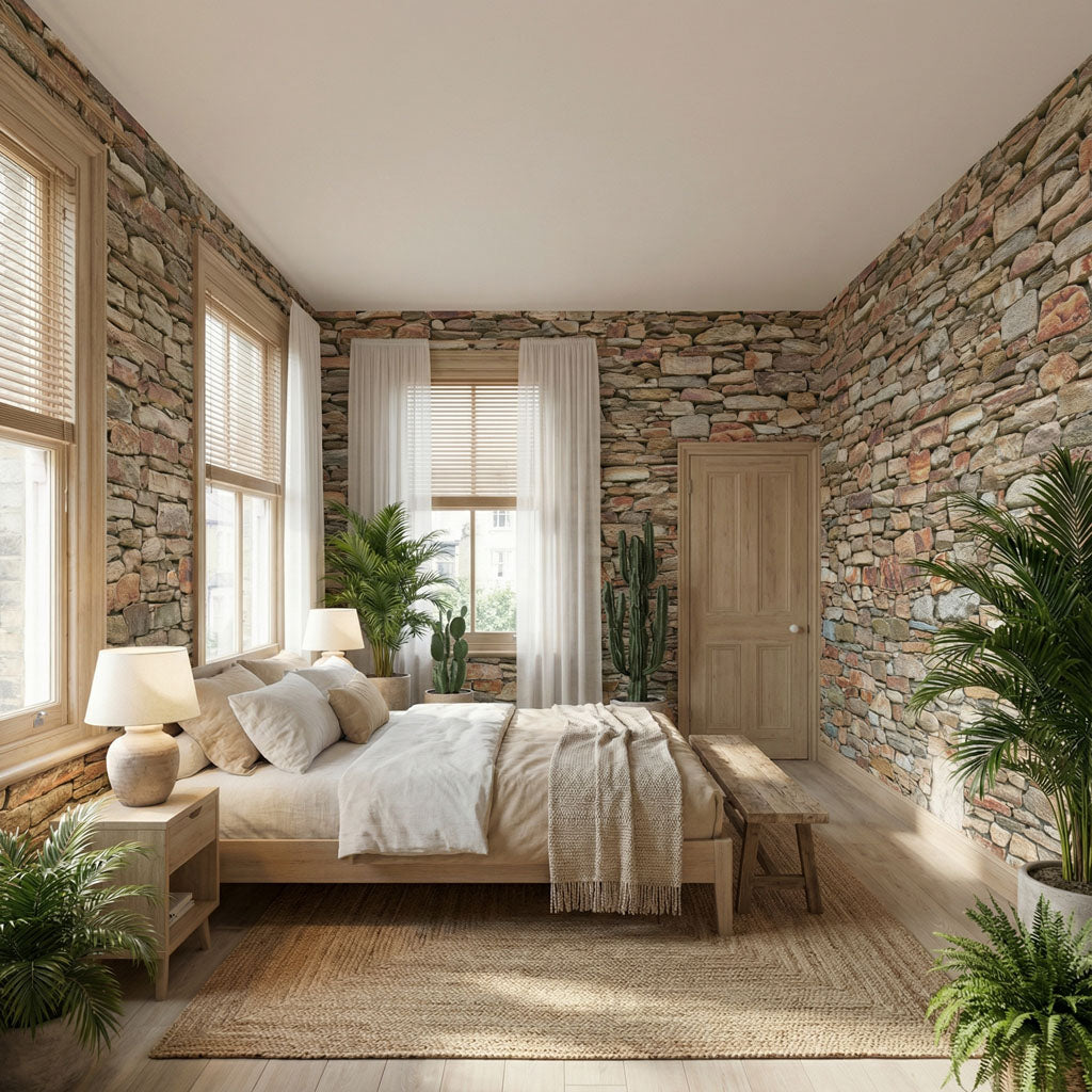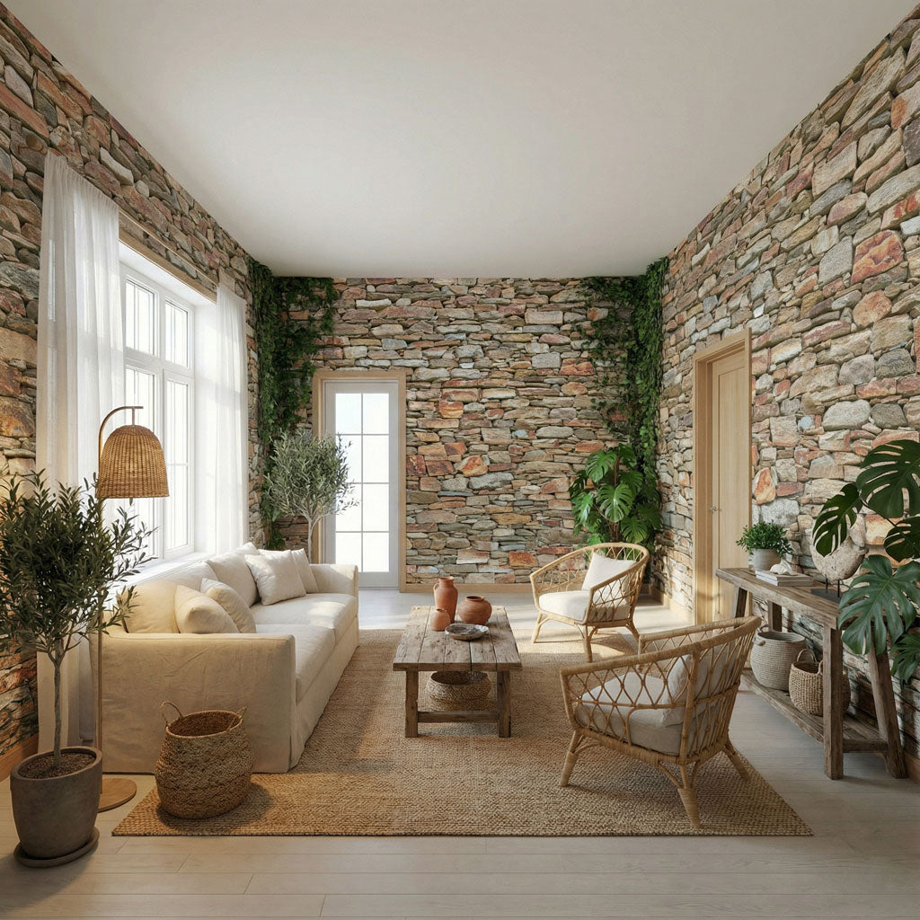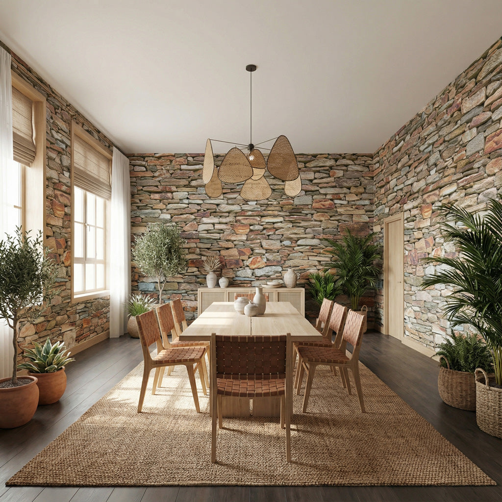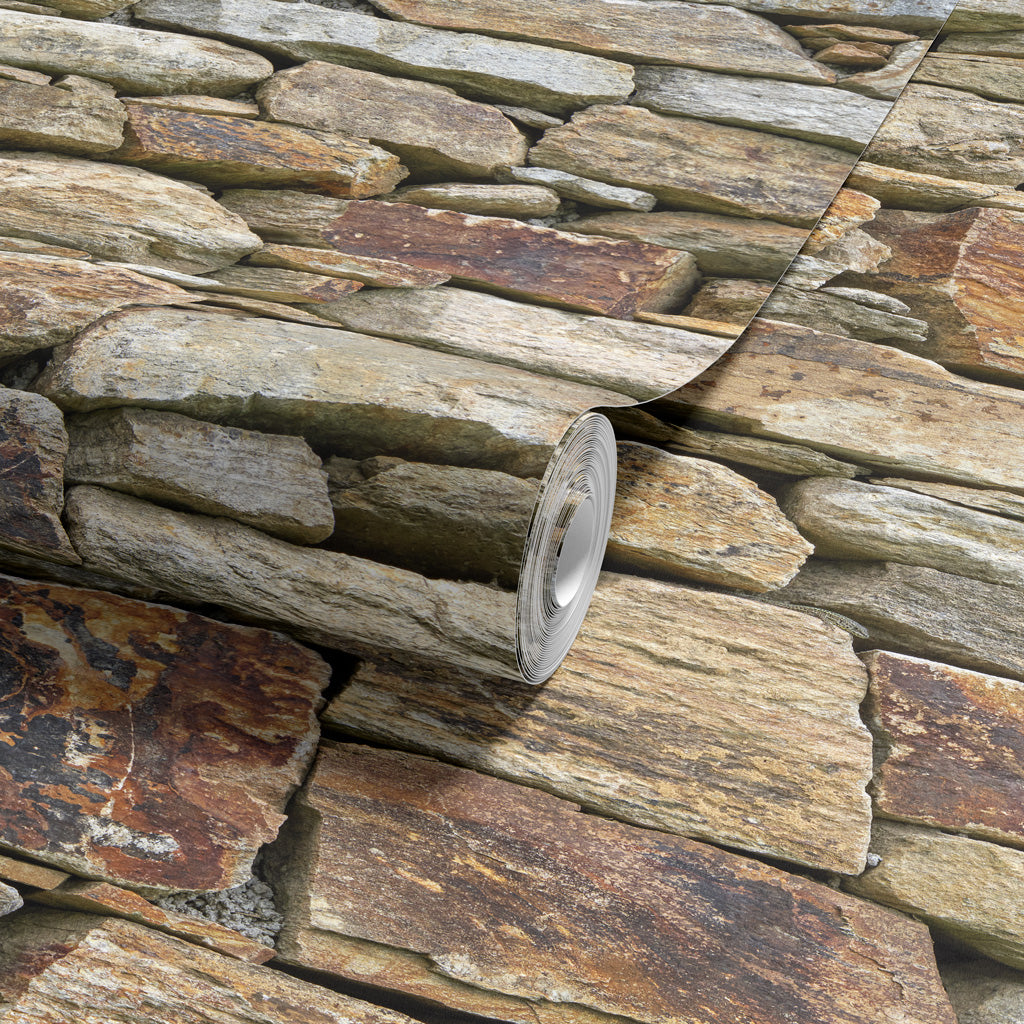 Inspired by the shepherds' walls that crisscross the mountains of Alta Rocca, this wallpaper features a vibrant, multicolored stone texture. The design showcases a wild mix of pink granite, dark schist, and sun-bleached fieldstones, assembled without mortar in an authentic style. This rich, mineral palette brings the warmth and untamed spirit of the Corsican maquis to your walls, creating a striking focal point of character.