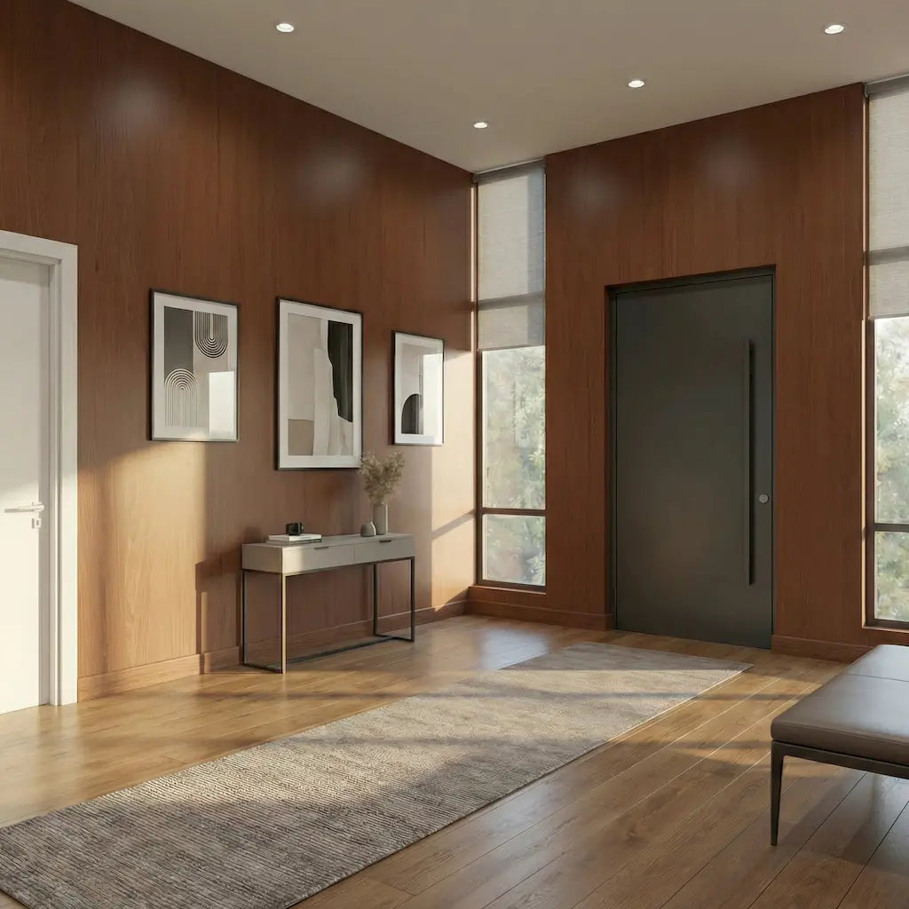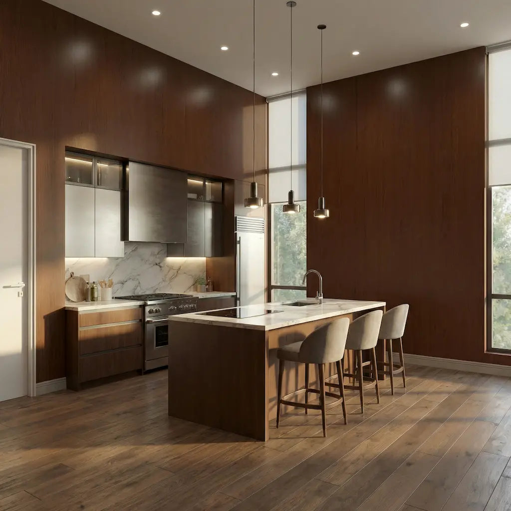 The pinnacle of luxury and mystery, Espresso is an ode to the deep night. This variation unfolds an ebony black hue crossed by imperceptible mahogany highlights, like a precious fabric in the shadows. Far from being a simple dark wood, it is a theatrical material that catches the light with subtlety to reveal unfathomable depth. It confers immediate authority and absolute glamour, transforming walls into a dark and magnetic work of art.